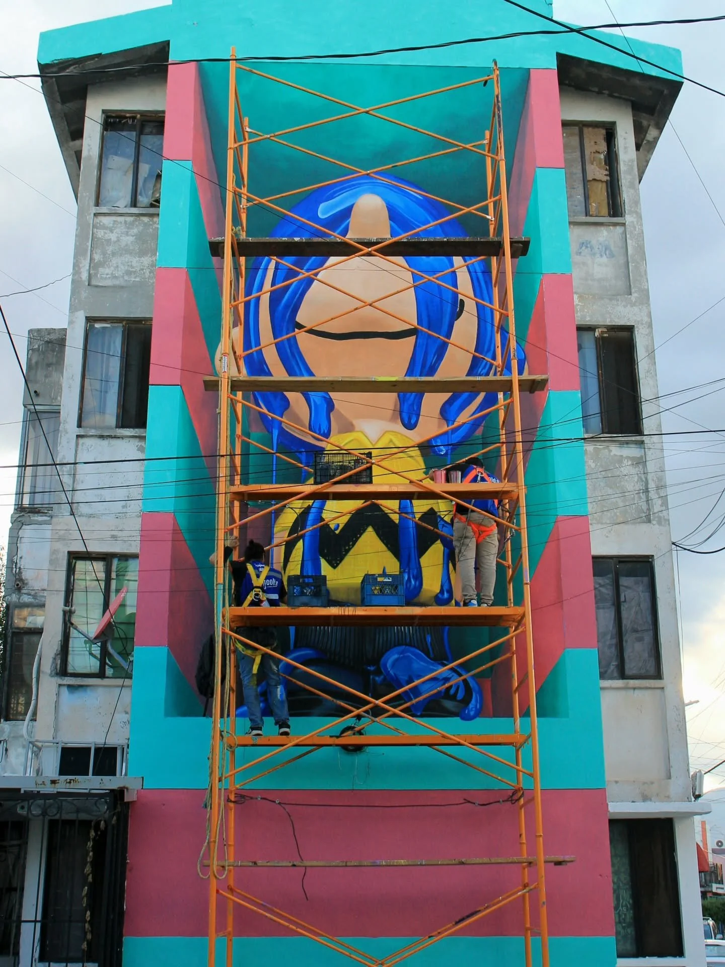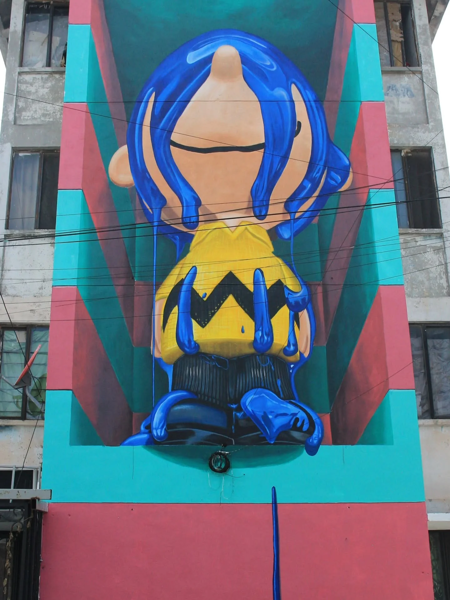En este mural, según el artista, Charlie Brown representa la infancia y el azul, el autismo.
