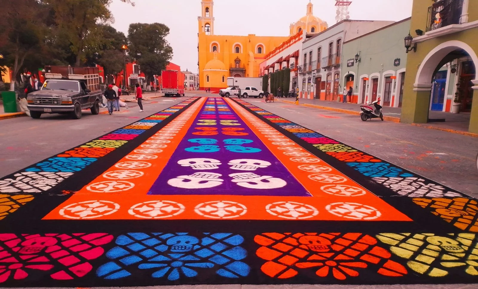 Los tapetes se elaboran con capas de aserrín teñido de diferentes colores, con moldes y plantillas que permiten formar flores, calaveras, símbolos y patrones geométricos. Cada artista o grupo de familias imprime su estilo, creando composiciones únicas que dialogan con la memoria de la celebración y el entorno urbano.