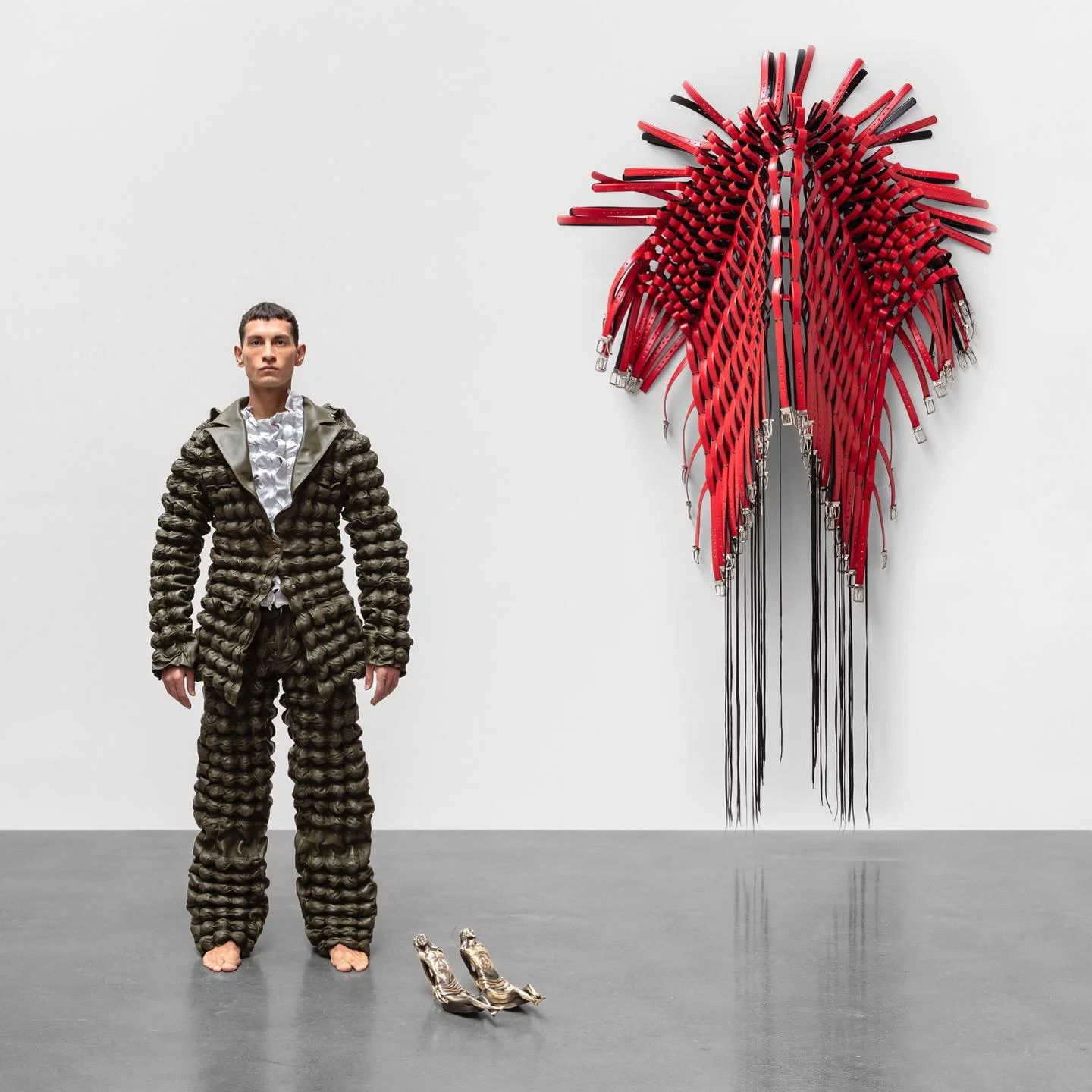 Sus piezas se sienten más cercanas a una acción artística que a un desfile tradicional. Hay teatralidad, performance, incomodidad y humor ácido. El cuerpo aparece como territorio de tensión, no como maniquí pasivo.